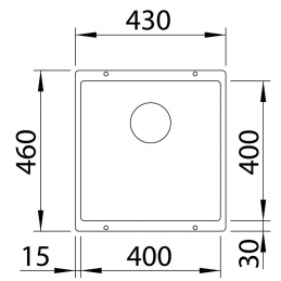 Összmérete 430 × 460 mm, tágas medencéje 400 × 400 mm (mélység 190 mm), így elegendő helyet biztosít a mindennapi konyhai tevékenységekhez. A felső perem hiánya lehetővé teszi a szennyeződések egyszerű letörlését közvetlenül a mosogatóba, és optikailag növeli a munkafelületet.