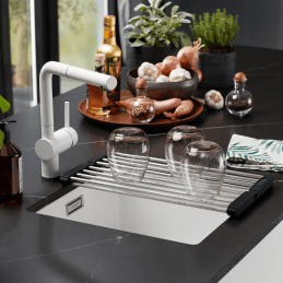 Az alsó beépítésnek köszönhetően a mosogató egy síkban van a munkalappal, így a szennyeződések könnyen letörölhetők közvetlenül a medencébe, és tiszta, harmonikus, átmenetmentes megjelenést biztosít.