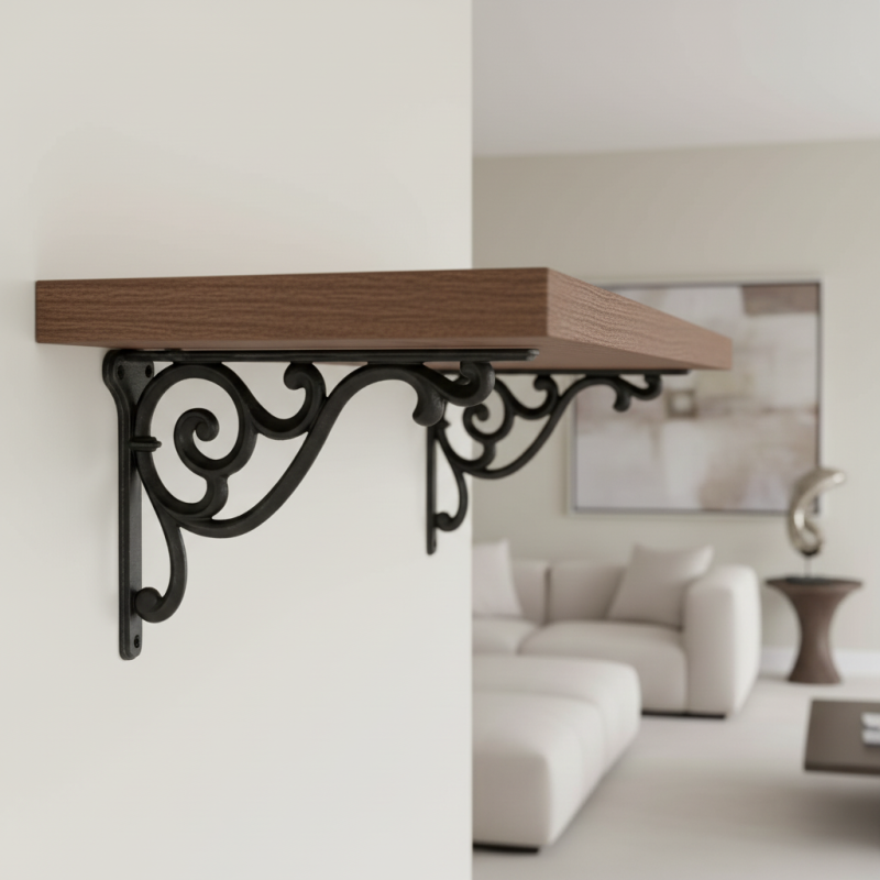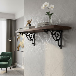 Masszív és dekoratív vintage stílusú polctartó, amely nemességet és rusztikus eleganciát visz a belső térbe. Gazdagon formált ornamentikája és robusztus kivitele nemcsak praktikus, hanem rendkívül esztétikus elemmé is teszi, amely ideális konyhákba, nappalikba, folyosókra vagy vidéki házakba.
