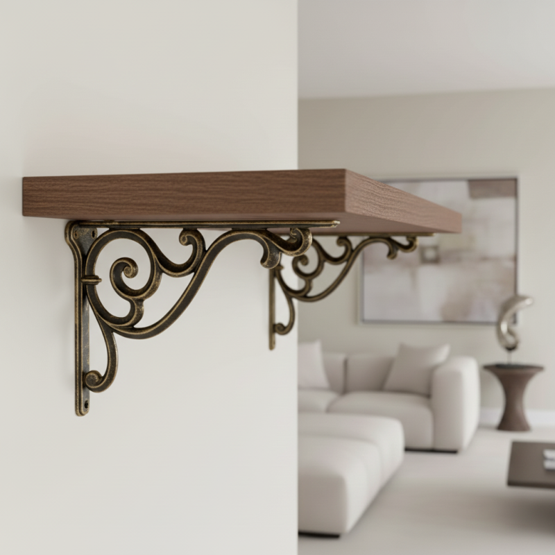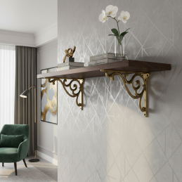 Elegáns és feltűnő polctartó rusztikus stílusban, amely a antik sárgaréz felületkezelésnek köszönhetően luxus, meleg hatást kelt, és első pillantásra magára vonja a figyelmet. Gazdagon formázott ornamentikája és masszív kidolgozása nemcsak funkcionális, hanem dekoratív elemmé is teszi ezt a tartót, ideális hagyományos enteriőrökbe, vidéki konyhákba, nappalikba vagy nyaralókba.