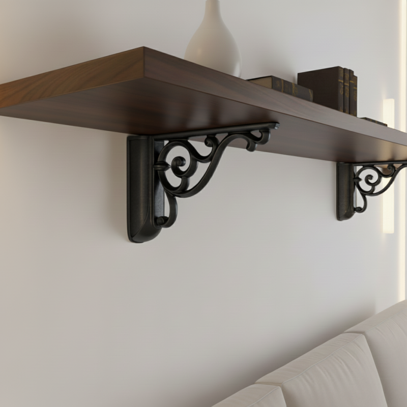 Stílusos rusztikus polctartó elegáns antikfekete kivitelben, amely egyedi vintage karaktert kölcsönöz otthonának. A dekoratívan formázott dizájn ötvözi a masszivitást és az esztétikát, így ideális konyhákba, nappalikba, előszobákba vagy vidéki stílusú otthonokba.