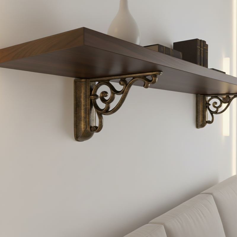 Elegáns rusztikus polctartó luxus antik sárgaréz kivitelben, amely hagyományos, kézműves és dekoratív jelleget kölcsönöz a belső térnek. Masszív fém szerkezetének köszönhetően ideális konyhába, nappaliba, előszobába vagy vidéki stílusú otthonokba.