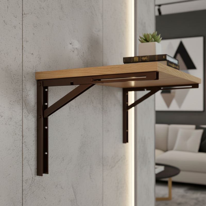 Univerzális lehajtható konzol, ideális polcokhoz, összecsukható asztalokhoz, munkalapokhoz vagy bárpultokhoz. Masszív acél szerkezet elegáns sötétbarna színben, amely nagy szilárdságot, hosszú élettartamot és vonzó megjelenést biztosít, amely illik modern és hagyományos enteriőrökbe is.
