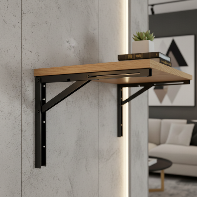Praktikus lehajtható konzol, amely alkalmas polcokhoz, összecsukható asztalokhoz, munkalapokhoz vagy bárpultokhoz. Masszív fém szerkezetének köszönhetően stabil támaszt nyújt, lehajtva pedig minimális helyet foglal, így ideális kis helyiségekbe, konyhákba, műhelyekbe vagy irodákba.