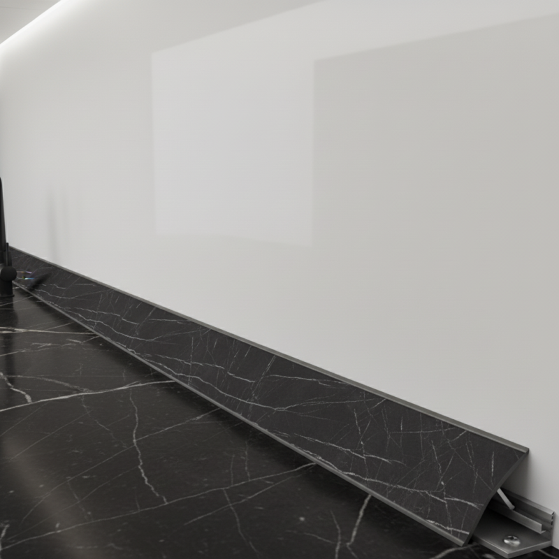 Két részből áll – az alsó rész csavarozható vagy ragasztható a munkalaphoz, a felső rész pedig rápattintható az alsóra, így szilárd, pontos és esztétikus lezárás jön létre, ugyanabban a dekorban, mint a munkalap.