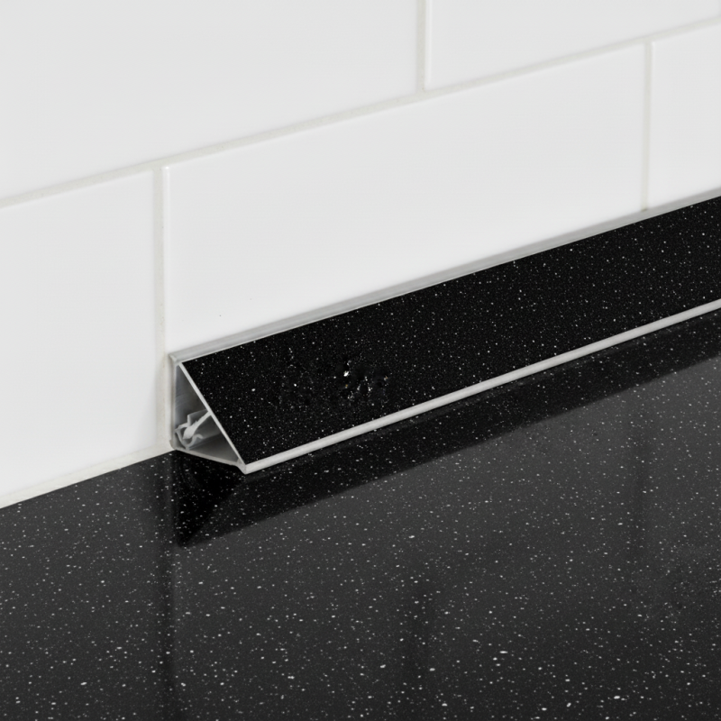 Luxusos és feltűnő KRONOSPAN tömítő profil Andromeda Fekete fényes (K218 GG) dekorban, amely professzionális és precíz munkalap lezárásra szolgál. A profil megbízhatóan tömíti a munkalap és a fal közötti illesztést, így hatékonyan megakadályozza a víz és szennyeződések bejutását, ugyanakkor exkluzív és elegáns fekete márvány megjelenést kölcsönöz a konyhának, finom csillogással és magas fényű felülettel.