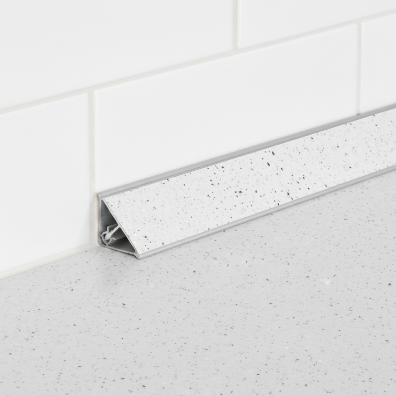 Elegáns és időtlen KRONOSPAN tömítő profil Andromeda matt fehér (K217 GM) dekorban, amely professzionális és esztétikus munkalap lezárásra szolgál. A profil megbízhatóan tömíti a munkalap és a fal közötti illesztést, így hatékonyan megakadályozza a víz és szennyeződések bejutását, miközben a konyhának finom, tiszta és modern fehér márvány megjelenést kölcsönöz, diszkrét csillogással és matt felülettel.