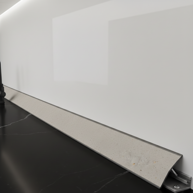 Két részből áll – az alsó rész csavarozható vagy ragasztható a munkalapra, a felső rész pedig rápattintható az alsóra. Így stabil, pontos és elegáns lezárás jön létre, ugyanabban a dekorban, mint a munkalap.