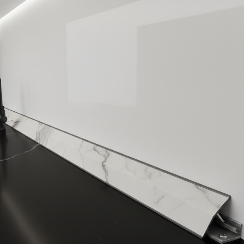 Két részből áll – az alsó rész csavarozható vagy ragasztható a munkalapra, a felső rész pedig rápattintható az alsóra. Így szilárd, pontos és egységes lezárás jön létre, ugyanabban a dekorban, mint a munkalap.