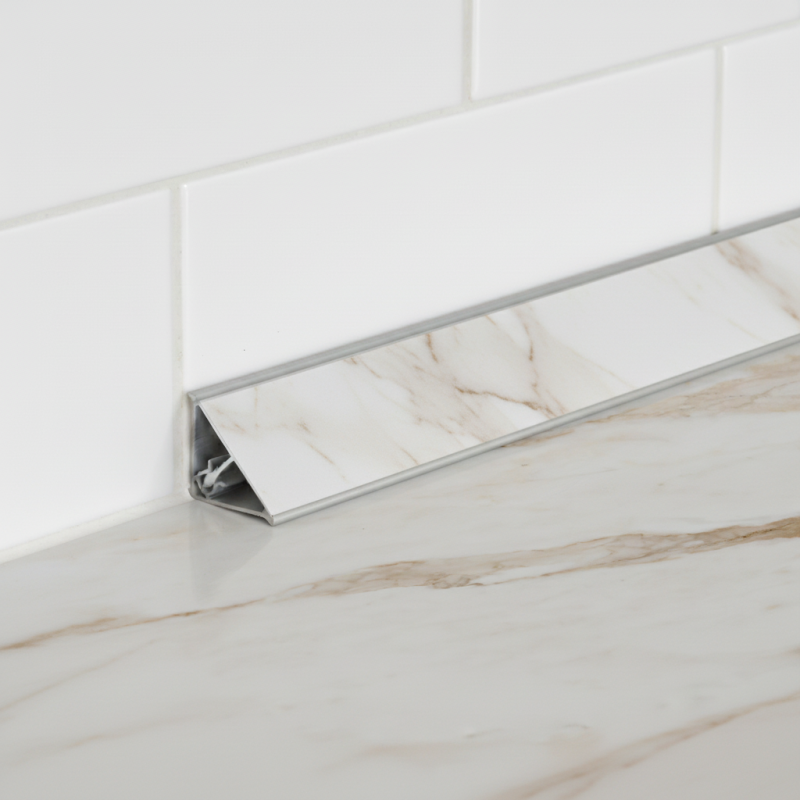 Luxusos és modern KRONOSPAN tömítő szegélyléc Calacatta Ambrosio (K699 PN) dekorban, amely professzionális és precíz munkalap lezárásra szolgál. A szegélyléc megbízhatóan tömíti a munkalap és a fal közötti rést, így hatékonyan megakadályozza a víz és szennyeződések bejutását, és egyben elegáns, exkluzív fehér márvány megjelenést kölcsönöz a konyhának, karakteres szürkésbarna erezettel és finom gyöngyházfényű hatással.