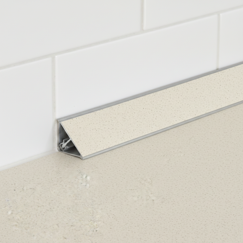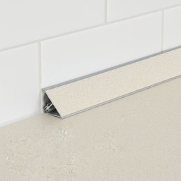Könnyű és elegáns KRONOSPAN tömítő profil White Dunes (K215) dekorban, amelyet professzionális és precíz munkalap lezárásra terveztek. A profil megbízhatóan tömíti a munkalap és a fal közötti rést, így hatékonyan megakadályozza a víz és szennyeződések bejutását, miközben a konyhának finom, természetes és modern megjelenést kölcsönöz a világos kő vagy homokkő hatásával, lágy textúrával és visszafogott felületi struktúrával.