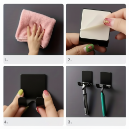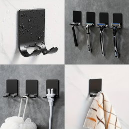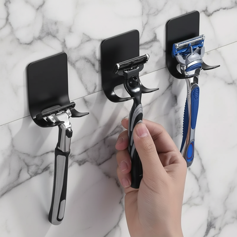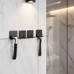 Praktikus öntapadós borotvatartó akasztó elegáns fekete színben ideális kiegészítő minden fürdőszobába. Minimalista dizájnjának és kompakt méretének köszönhetően diszkrét, higiénikus és biztonságos helyet biztosít a borotva tárolására.