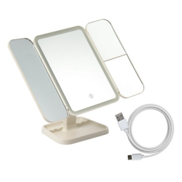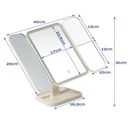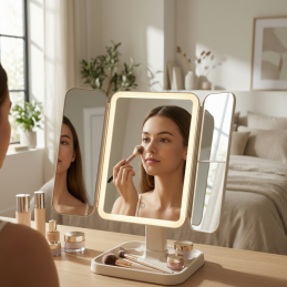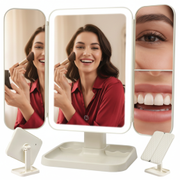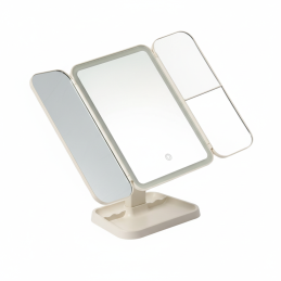 Az elegáns TREND kozmetikai tükör LED világítással kis otthoni szépségszalonná varázsolja a fésülködőasztalát. A háromrészes, kihajtható kialakítás középső tükörrel és oldalsó szárnyakkal lehetővé teszi a kényelmes sminkelést, bőrápolást és frizurakészítést több szögből. A praktikus beépített rendező helyet biztosít a kozmetikumok és apró kiegészítők tárolására.