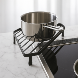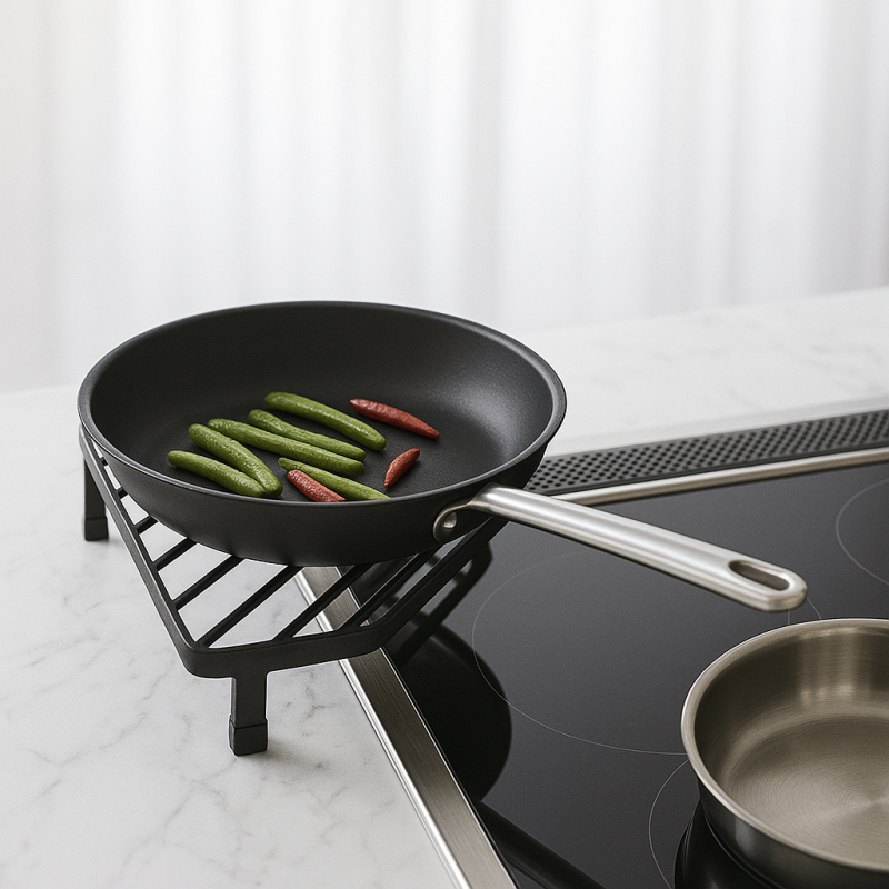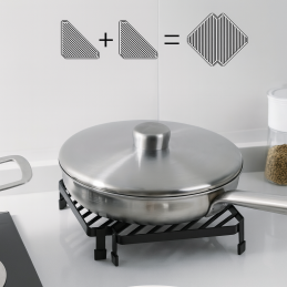 Stílusos és praktikus sarok tároló polc ideális kiegészítő a konyhapulthoz – különösen a tűzhely melletti területen. Lehetővé teszi a forró serpenyők, lábasok vagy konyhai edények biztonságos és kényelmes elhelyezését anélkül, hogy veszélyeztetné a munkalap épségét.