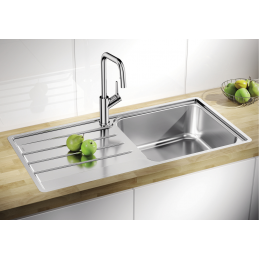Blanco LEMIS XL 6 S-IF egy modern rozsdamentes acél konyhai mosogató kiváló minőségű kidolgozással, amelyet a mindennapi használat maximális kényelmére terveztek. Nagyvonalú 1000 × 500 mm méretével elegendő munkaterületet kínál, és a extra nagy és mély medencének köszönhetően kényelmesen tisztíthatók benne a nagyobb edények és tepsik is.