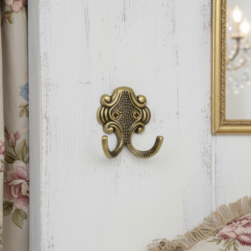 Rusztikus fogas VENICE Mini antik sárgaréz felülettel antik sárgaréz dekoratív kiegészítő, amely eleganciát és hagyományos kézműves stílust kölcsönöz a bútornak vagy falnak. Gazdagon formázott ornamentika, finom domború részletek és kétkarú kialakítás teszi alkalmassá vidéki, vintage és klasszikus enteriőrökbe.