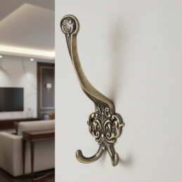 Az antik sárgaréz felületkezelés finom patinával kiemeli a plasztikus ornamentikát, és mélységet, valamint meleg fémes tónust ad a fogasnak. A dupla akasztó elegendő helyet biztosít kabátok, táskák vagy kiegészítők felakasztásához, és növeli a mindennapi használat praktikusságát. A fogas alkalmas előszobákba, folyosókra, gardróbokba, de stílusos szállodákba vagy panziókba is.