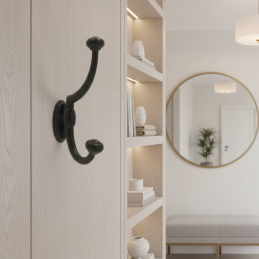 A rusztikus PLUTO fogas modern kivitelben fekete matt színben ötvözi a klasszikus formát az időtlen, minimalista megjelenéssel. A dupla akasztó praktikus helyet biztosít ruhák, táskák, hátizsákok vagy kiegészítők felakasztására, miközben a matt felület elegáns és visszafogott hatást kelt.