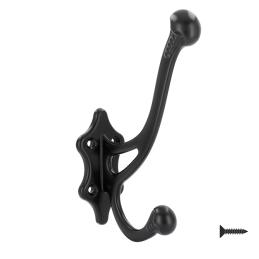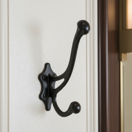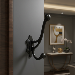 Stílusos rusztikus WOLFGANG fogas matt fekete kivitelben, amely hangsúlyos kiegészítője a vintage, ipari vagy vidéki stílusú enteriőröknek. A dekoratívan formázott karok és a matt fekete felület kombinációja autentikus és elegáns megjelenést kölcsönöz a térnek.