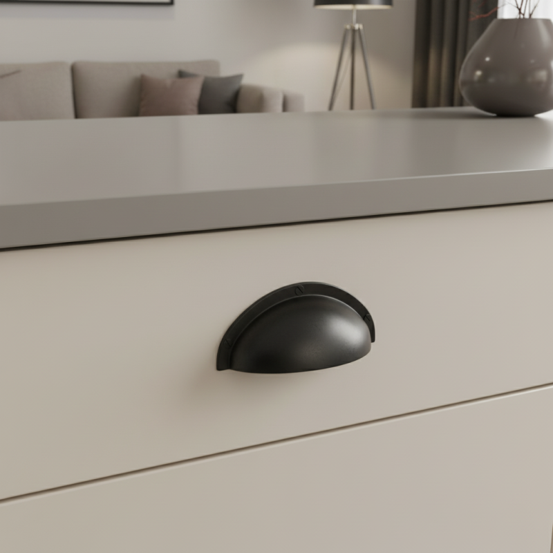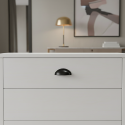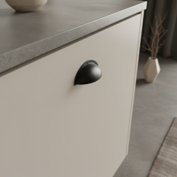 A ZENA fogantyú fekete matt kivitelben ötvözi a hagyományos kagylófogantyú formát a modern minimalista megjelenéssel. Félköríves kialakítása kényelmes fogást biztosít, míg a matt fekete felület hangsúlyos, elegáns és időtlen akcentust ad a bútornak.