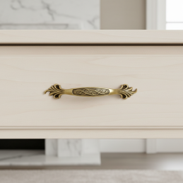 Az elegáns KAMILA bútorfogantyú antik sárgaréz kivitelben stílusos kiegészítő klasszikus, rusztikus vagy vintage bútorokhoz. A díszítő részletek és a finoman patinázott felület luxus és időtlen karaktert kölcsönöz a bútornak.