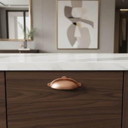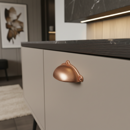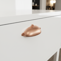 A MELANIE fogantyú elegáns réz kivitelben kivételes dizájnkiegészítő, amely meleg, stílusos és időtlen megjelenést kölcsönöz bútorának. A lekerekített „tál” alakú fogantyú kényelmes fogást biztosít, miközben finom retro hangulatot ad, amely réz árnyalatban hangsúlyos dekoratív elemmé válik.