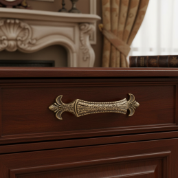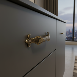 A VERDI fogantyú antik sárgaréz felülettel nemességet, hagyományos stílust és kézműves esztétikát visz a belső térbe. Gazdag domborminták, díszített kontúrok és jellegzetes forma utalnak a történelmi dizájnra, amely egyedi és luxus megjelenést kölcsönöz a bútornak.