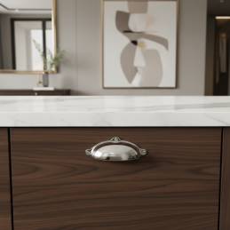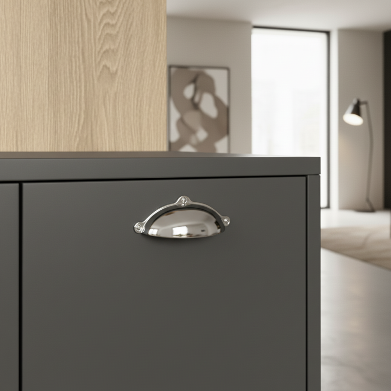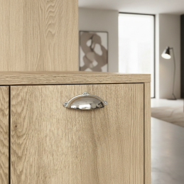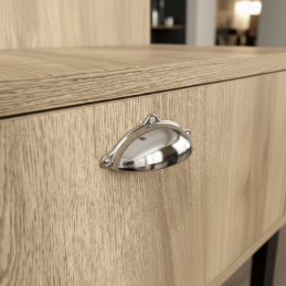A MELANIE fogantyú fényes króm kivitelben modern és egyben elegáns kiegészítő, amely tiszta, luxus és időtlen megjelenést kölcsönöz bútorának. A lekerekített „tál” forma kényelmes és természetes fogást biztosít, miközben a magasfényű króm vonzó tükörhatást kelt.