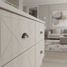 A dekoratív „csavaros” részletek az előlapon tovább erősítik a fogantyú hagyományos megjelenését és kiemelik kézműves stílusát. A ZENA fogantyú ideális választás farmhouse stílusú konyhákba, vidéki enteriőrökbe, komódokra vagy szekrénysorokhoz, amelyek retro hangulatot árasztanak.