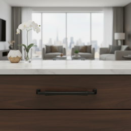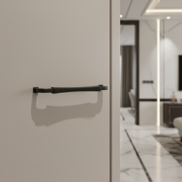 A NEUS fogantyú fekete matt kivitelben modern, merész, ugyanakkor elegáns megjelenést kölcsönöz a belső térnek. Finoman ívelt teste és jellegzetesen formázott végei időtlen hatást keltenek, de fekete matt színben a fogantyú kifejezetten kortárs, sőt ipari jelleget kap. Ez a felület szépen kontrasztál a világos ajtókkal és a természetes fával, prémium, dizájnos hangsúlyt adva a bútornak.