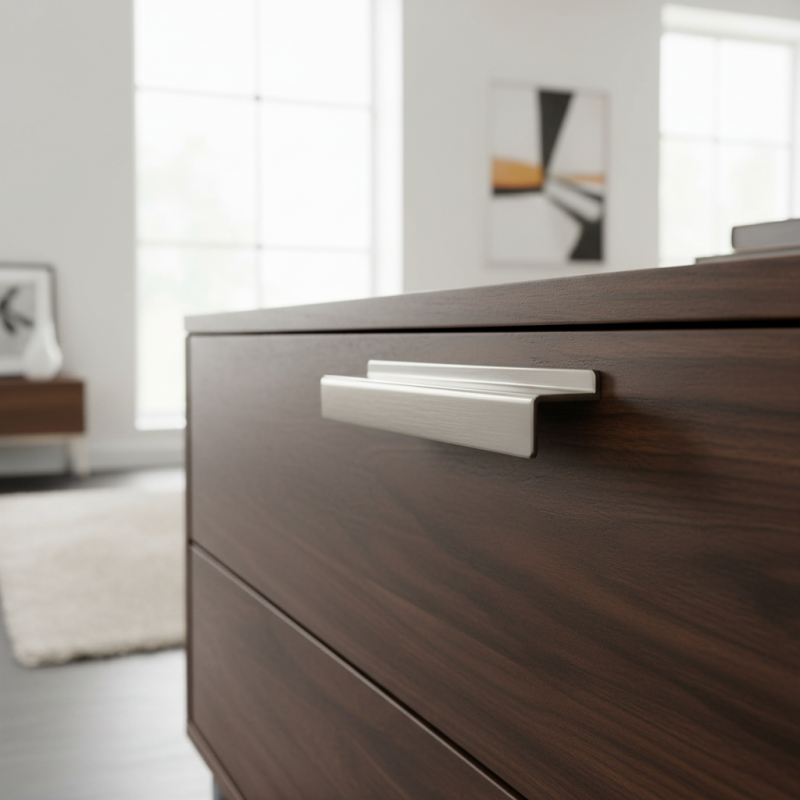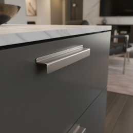 A BRUNA fogantyú csiszolt nikkel kivitelben elegáns és modern megoldás konyhai, fürdőszobai és nappali bútorokhoz. Minimalista, szögletes L-fogantyúként lett tervezve, amely az ajtó vagy a fiók felső élére szerelhető. Formája kényelmes fogást biztosít a klasszikus, látható fogantyúk nélkül, így tiszta és korszerű dizájnt teremt.