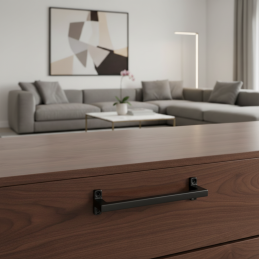 A REBECA fogantyú matt fekete kivitelben modern és feltűnő bútorkiegészítő, amely tökéletesen ötvözi a rusztikus elemeket a minimalista dizájnnal. Tiszta, szögletes vonalai és masszív szerkezete időtlen hatást keltenek, miközben a matt fekete felület luxus, karakteres és egyben univerzális megjelenést kölcsönöz a fogantyúnak.