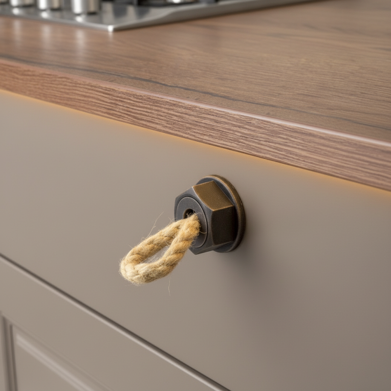 A kötél fogantyú kellemes tapintású, puha, ugyanakkor tartós. A műanyag alap antik fekete felülettel vizuálisan a fémet idézi, ami szépen kiegészíti a rusztikus megjelenést anélkül, hogy feleslegesen megterhelné az egész komponenst.