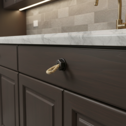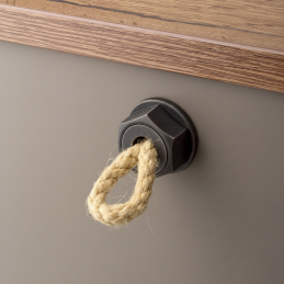 A SPACCATA gomb fogantyú antik fekete felülettel az eredeti dekoratív műanyag alap és az erős természetes kötél kombinációját képviseli. Ez a dizájn ötvözi a kézműves, vidéki és ipari stílust, így a fogantyú azonnal domináns részletté válik komódokon, szekrényeken vagy konyhai ajtókon.