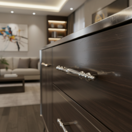 A SANDVIKA fogantyú fényes króm felülettel tökéletes választás olyan enteriőrökbe, ahol a klasszikus elegancia modern csillogással párosul. Kidolgozott formája dekoratív elemekkel nemes hatást kelt, és különleges karaktert ad a bútornak – legyen szó komódról, vitrinszekrényről, szekrényről vagy fiókról.