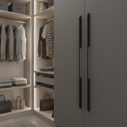 Elegáns HANNA gardróbfogantyú fekete matt kivitelben modern és karakteres dizájnelem, amelyet elsősorban magas gardróbszekrényekhez és nagy ajtókhoz terveztek. Karcsú, minimalista formája finom, 45°-os töréssel tiszta, építészeti megjelenést kölcsönöz, miközben kényelmes fogást biztosít.