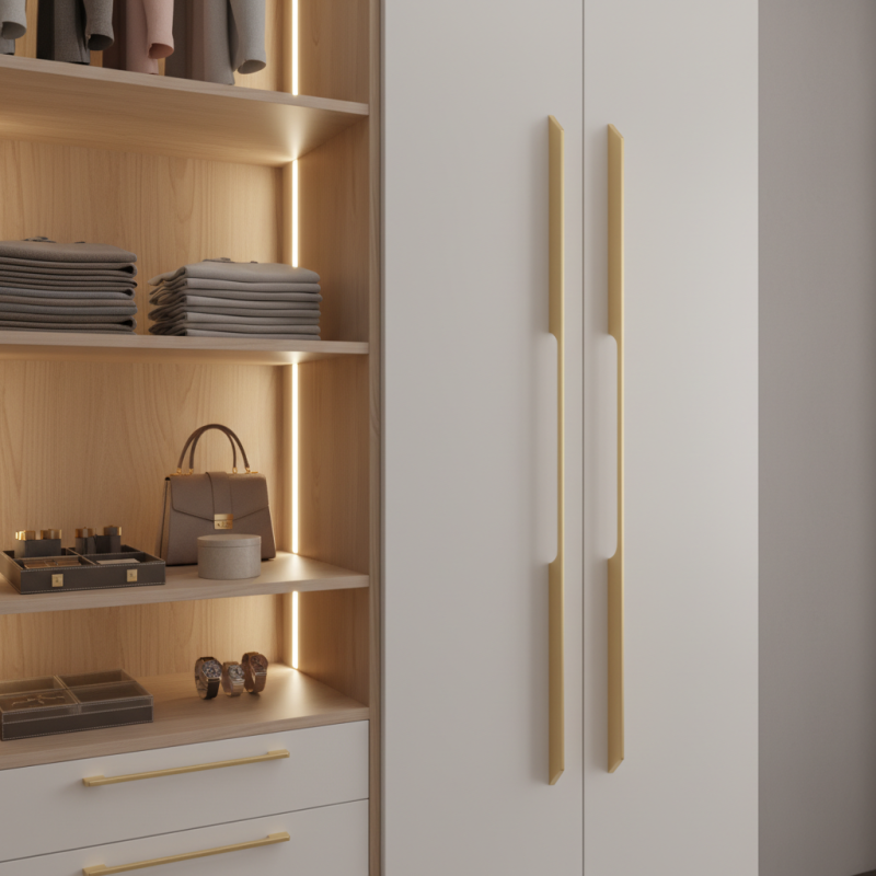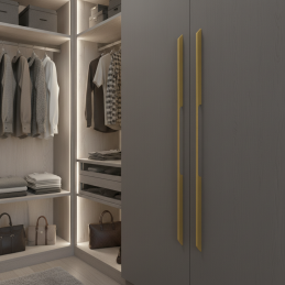 A HANNA gardróbfogantyú modern, elegáns arany kivitelben kifejező dizájnelem, amelyet magas gardróbszekrényekhez és nagyméretű ajtókhoz terveztek. Karcsú, minimalista formája finom, 45°-os töréssel luxus hatást kelt, ugyanakkor kényelmes fogást biztosít.