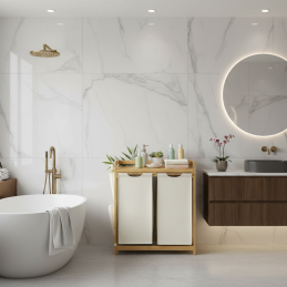 A természetes fa melegséget és harmóniát visz a fürdőszobába, miközben a tiszta fehér árnyalat modern és friss hatást kelt.