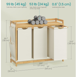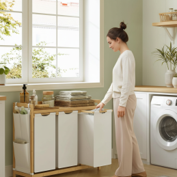 A tágas és elegáns SPA HARMONY TRIO szennyestartó praktikus megoldást kínál azoknak a háztartásoknak, amelyek szeretnék a szennyest átláthatóan szétválogatni. A masszív bambusz váz és a három fehér textilzsák kombinációja harmonikus, természetes megjelenést kölcsönöz, amely fürdőszobába és mosókonyhába egyaránt alkalmas.