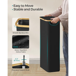 A szennyestartó kiváló minőségű, 600D vastag Oxford anyagból készült, amely víz- és szakadásálló, ugyanakkor könnyen tisztítható. A belső szerkezetet üvegszálas rudak támasztják alá, amelyek biztosítják a stabilitást és a tartósságot rendszeres használat mellett is. Ez a kosár úgy lett tervezve, hogy hosszú évekig hűséges társa legyen.