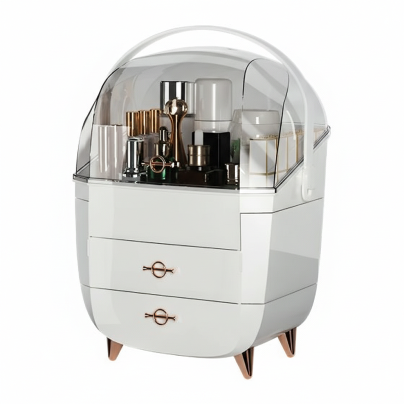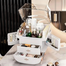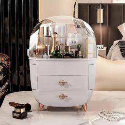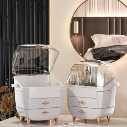 A rendszerező nagy tárolókapacitást kínál a tágas fiókoknak és a nagy felső tárolórekesznek köszönhetően átlátszó védőfedéllel, amely megvédi a kozmetikumokat a portól, ugyanakkor gyors és egyszerű áttekintést biztosít az elhelyezett termékekről. Gond nélkül elférnek benne parfümök, krémek, balzsamok, sminkek és bőrápolási termékek is.