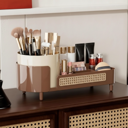 Elegáns és praktikus forgatható MAKEUP rendszerező modern barna kivitelben, amely ideális megoldás a kozmetikumok, ecsetek és mindennapi beauty kiegészítők átlátható tárolására. Időtlen dizájnjának és finoman bordázott falainak köszönhetően stílusos megjelenést kölcsönöz, és egyben dekoratív eleme is lehet a belső térnek.