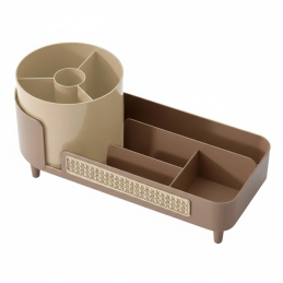 A rendszerező forgatható ecsettartóval van felszerelve, amely 360°-ban elfordul, így gyors és kényelmes hozzáférést biztosít minden elhelyezett eszközhöz. Az alsó rész praktikus rekeszeket kínál rúzsok, krémek, smink, parfümök vagy apró kozmetikumok számára.