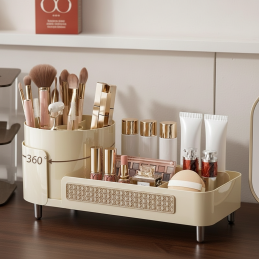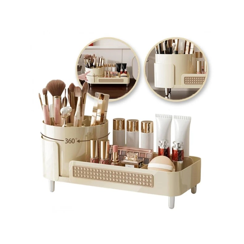 A rendszerező forgó ecsettartóval van felszerelve, amely 360°-ban forgatható, így gyors és kényelmes hozzáférést biztosít minden tárolt eszközhöz. Az alsó rész praktikus rekeszeket kínál rúzsok, krémek, smink, parfümök vagy kisebb kozmetikumok számára. Barázdált falak kölcsönöznek a rendszerezőnek modern és elegáns megjelenést.