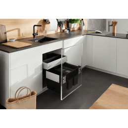 Úgy lett tervezve, hogy megakadályozza a tisztítószerek, szivacsok, szemeteszsákok vagy kisebb eszközök átláthatatlan felhalmozódását. A sötét, prémium dizájn organikusan illeszkedik a BLANCO hulladékrendszerekhez, és a szekrény kinyitásakor vizuálisan egységes, elegáns egészet alkot.